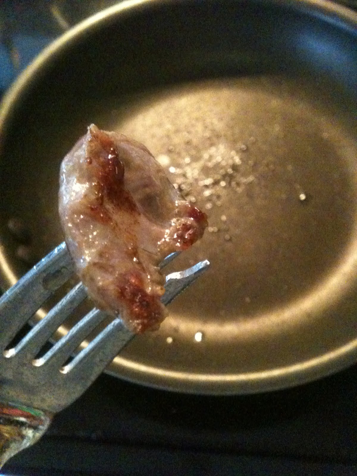 A little olive oil, a little pepper on magenta flesh sizzling in the pan. As soon as the meat browned and curled it looked less like the little squirrel body I just discarded.